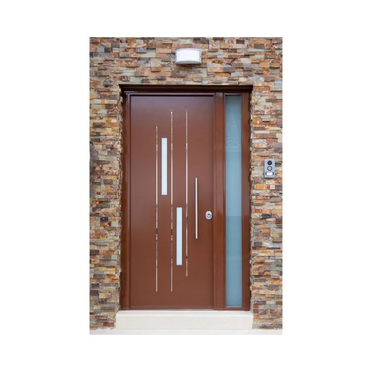 Puerta acorazada fabricada sobre superficie de aluminio termolacado con terminación lisa.