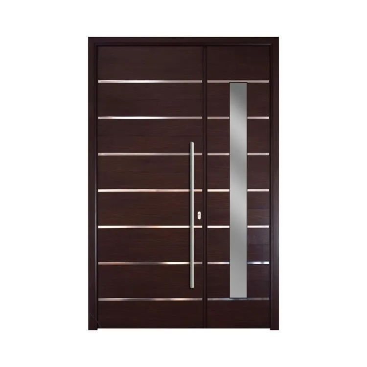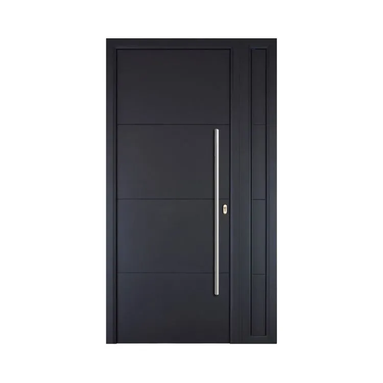 Puerta acorazada fabricada sobre superficie de aluminio termo-lacado con incrustaciones de aluminio o línea estampada en cualquier color de la carta RAL, lacados efecto madera o en terminaciones especiales como el acero corten.